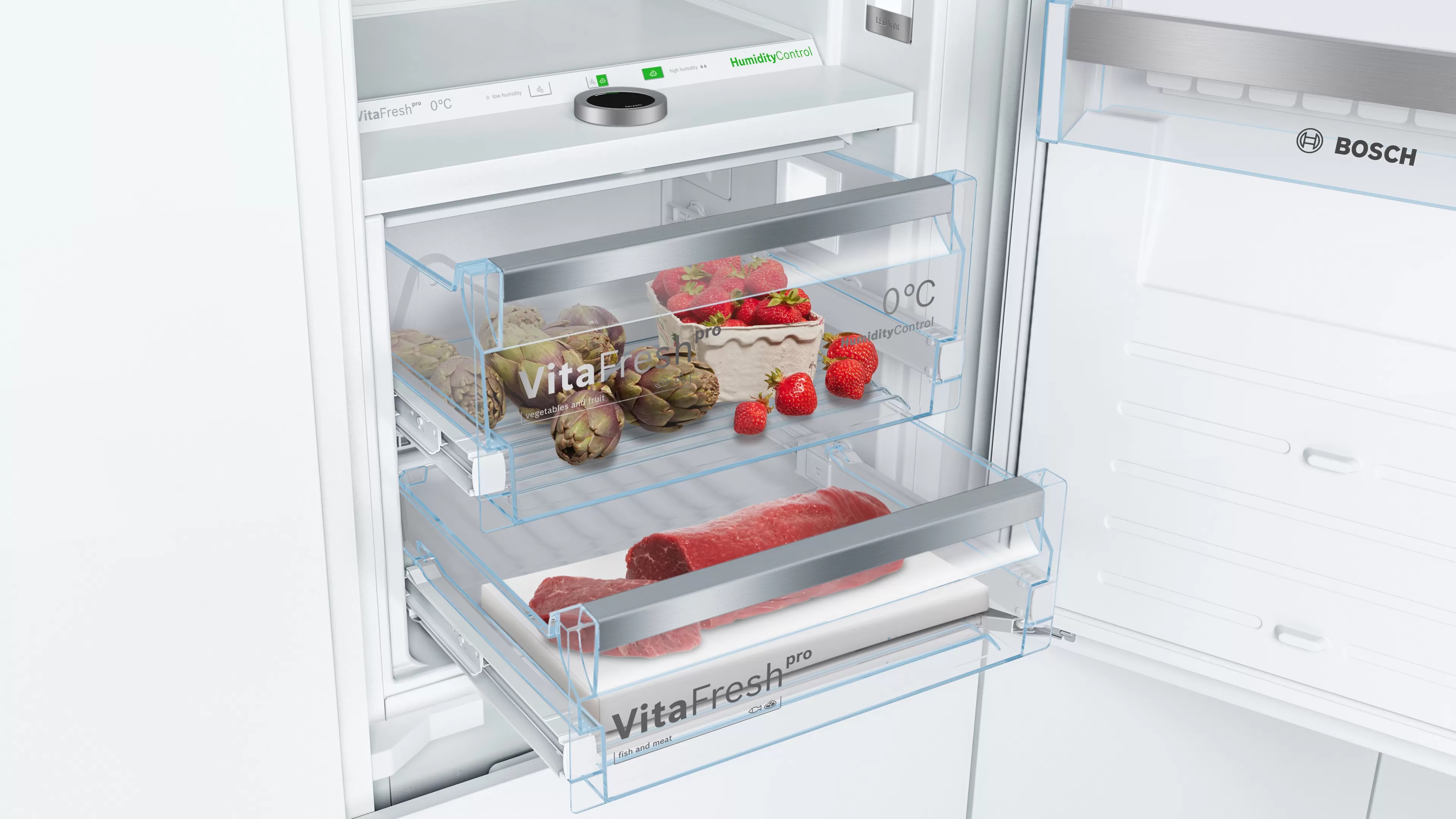 Vgradni hladilnik z zamrzovalnikom Bosch KIF86PFE0. S tehnologijo 0 °C in optimalno stopnjo vlažnosti zagotavlja sistem svežine VitaFresh pro optimalne pogoje shranjevanja vseh svežih živil. Z vrtljivim gumbom za nadzor vlage lahko intuitivno spremenite raven vlage za sadje, zelenjavo in kombinirano hrano z uporabo treh različnih nastavitev. Za več prostora lahko brez težav odstranite vse steklene police iz zamrzovalnega dela.