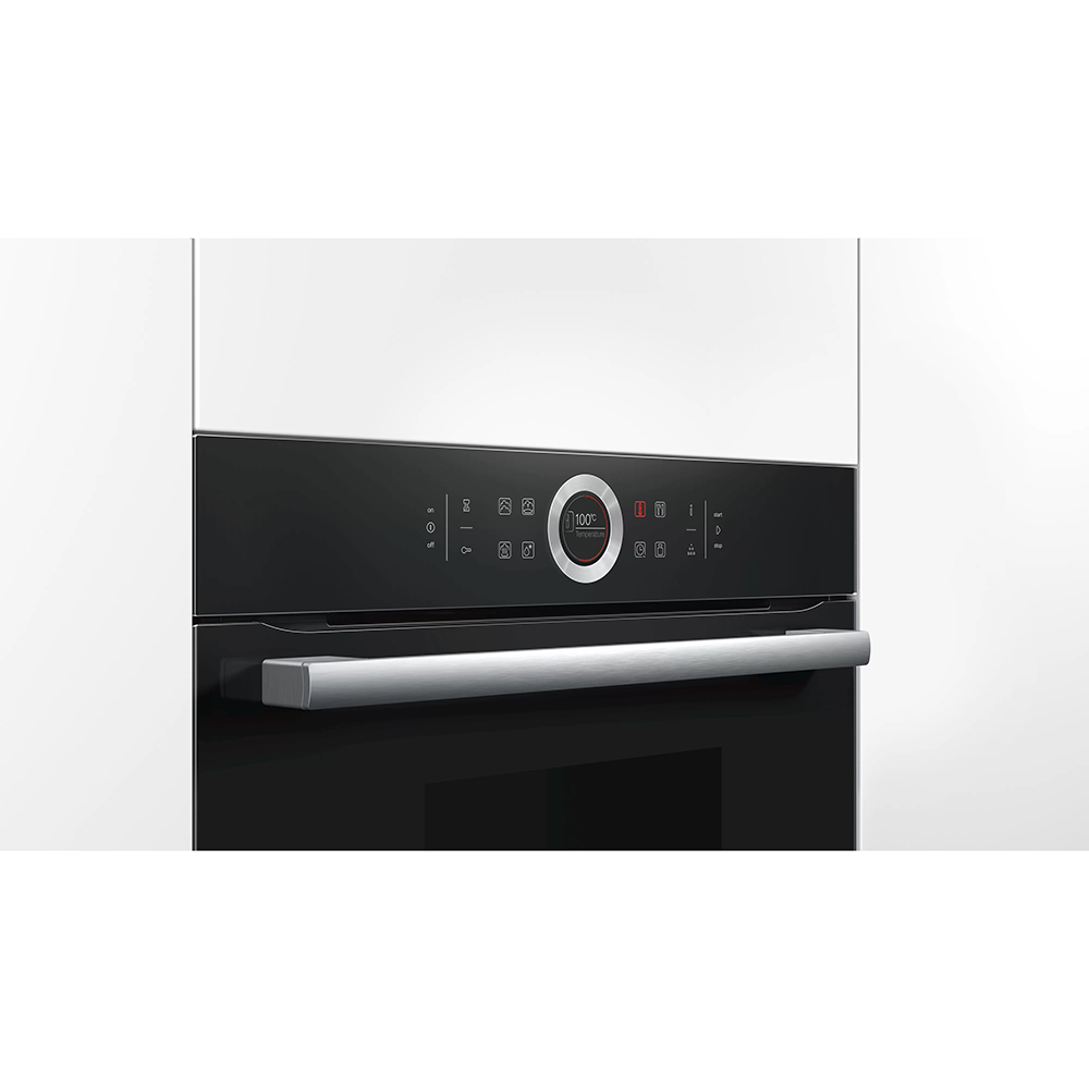Vgradna kompaktna parna pečica Bosch CDG634AB0 serije 8. Nežno kuhanje zelenjave s funkcijo pare jo ohranja čvrsto, piščanec in ribe pa ostanejo mehki in vlažni. Pri krmarjenju po možnostih programov na zaslonu na dotik vam jasni in živi simboli ter informativna sporočila pomagajo in vas vodijo skozi vsak korak. Mehanizma za blaženja SoftOpen in SoftClose preprečujeta trdo zapiranje vrat. 20 prednastavljenih avtomatskih programov zagotavlja popoln uspeh vsakega obroka.