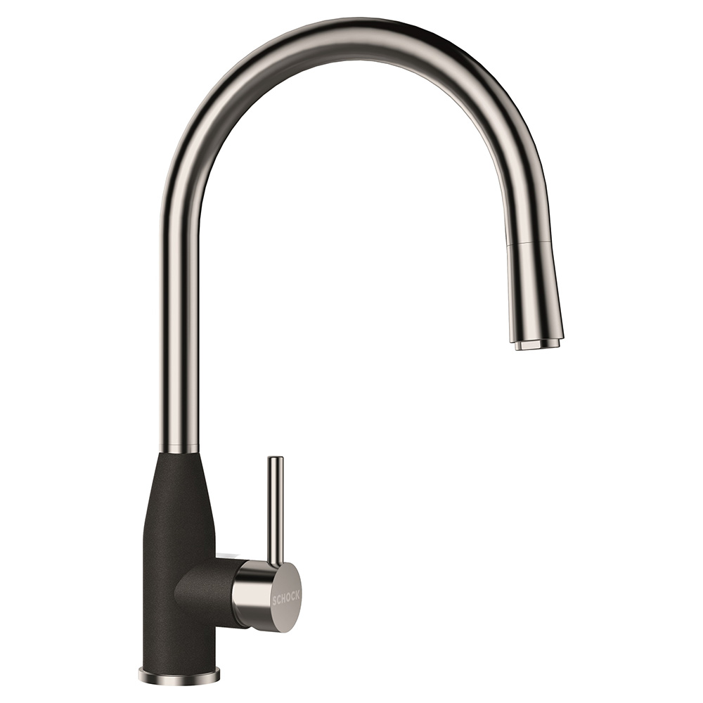 Kuhinjska armatura SCHOCK Kavus 559120 v črni barvi Onyx ima izjemno prefinjen in eleganten dizajn, zato se zraven nje zelo lepo poda pomivalno korito SCHOCK Formhaus. Izdelana je iz kroma ter naravnega kamna linije Cristalite®, da se bo lepše barvno uskladila z vašim koritom.