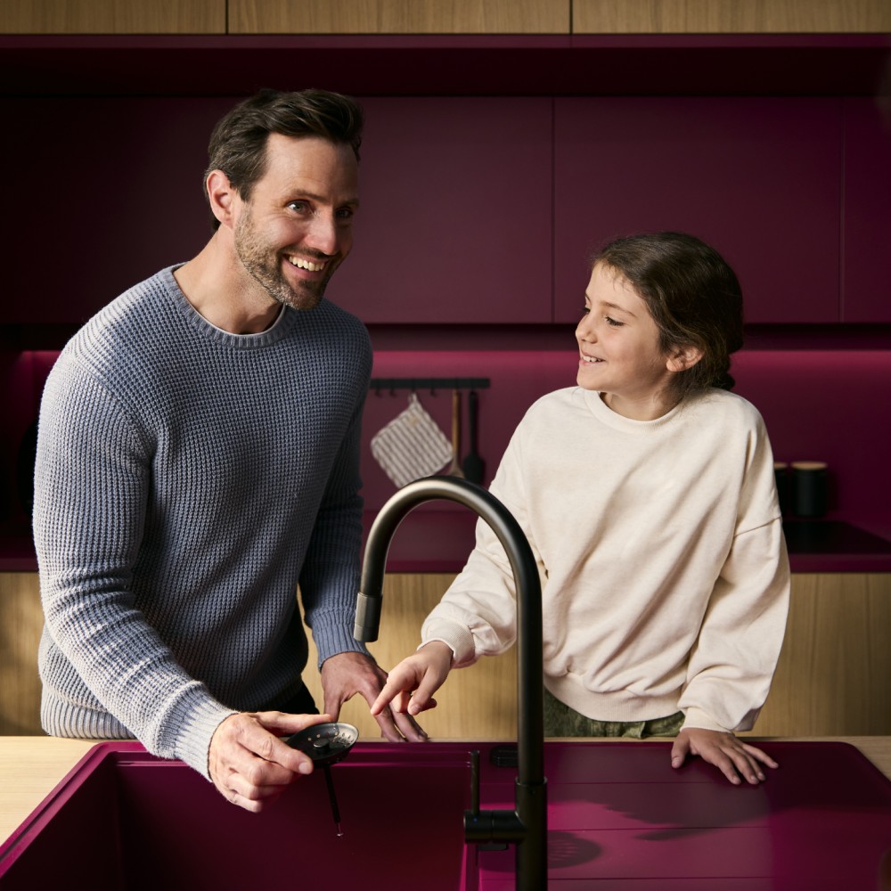 Armatura ima prav tako izvlečno ročko s kroglično glavo za maksimalno fleksibilnost ter možnost navadnega curka vode ali tuša za večjo učinkovitost čiščenja posode. Armaturi se lepo podajo vsa podvgradna korita kot so Schock Greenwich ali Kiruna. Na voljo je v tej črni barvi Black, v ponudbi pa je tudi v barvi plemenitega jekla.