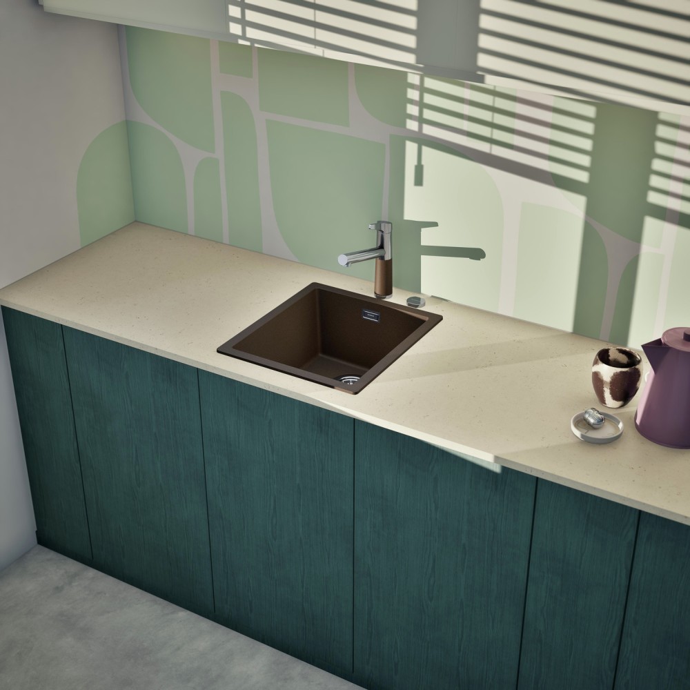 Kuhinjska armatura SCHOCK SC-510 je klasična brezčasna armatura, ki je delno kromirana, delno pa jo sestavlja naravni kamen. V tej temni barvi Bronze se ji zelo lepo poda pomivalno korito SCHOCK Greenwich v isti barvi.