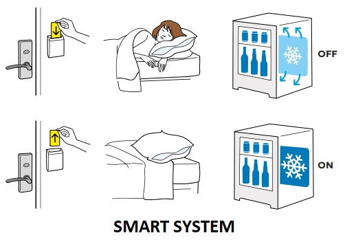 2. Smart System (pogoj je kartični sistem odpiranja hotelske sobe). Ko gost vstopi v sobo in vstavi kartico v nosilec, naprava za varčevanje z energijo pošlje signal pametnemu sistemu in kompresor minibara preneha delovati (izdelki v minibaru ostanejo hladni zaradi sproščanja hladu s strani evtektične plošče), ko pa gost sobo zapusti in odstrani kartico iz nosilca se minibar znova vklopi. V primeru, da gost ostane v sobi več ur in hladu, nabranega v evtektični plošči zmanjka, se minibar samodejno vklopi, da ohrani izdelke hladne. Če soba dolgo ni zasedena minibar deluje v načinu varčevanja z energijo. Za delovanje pametni sistem ne potrebuje nobenega elektronskega časovnika ali daljinskega upravljalnika.