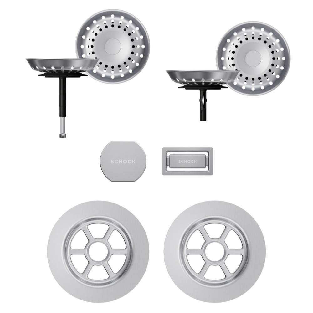 Vsako korito SCHOCK iz linije Cristadur® lahko opremite s setom izliv, preliv in gumb v petih barvah: srebrni (EDM), belo-zlati (White Gold), brušeni bakreni (Copper), brušeni temno sivi (Gunmetal) ter črni (Puro).