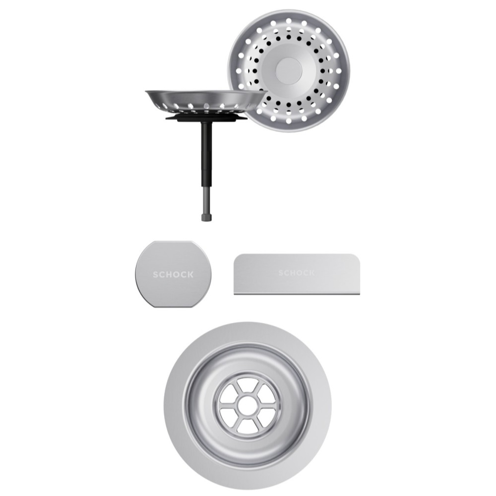 Vsako korito SCHOCK iz linije Cristadur® lahko opremite s setom izliv, preliv in gumb v petih barvah: srebrni (EDM), belo-zlati (White Gold), brušeni bakreni (Copper), brušeni temno sivi (Gunmetal) ter črni (Puro).