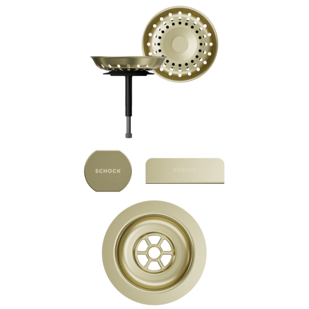 Vsako korito SCHOCK iz linije Cristadur® lahko opremite s setom izliv, preliv in gumb v petih barvah: srebrni (EDM), belo-zlati (White Gold), brušeni bakreni (Copper), brušeni temno sivi (Gunmetal) ter črni (Puro).