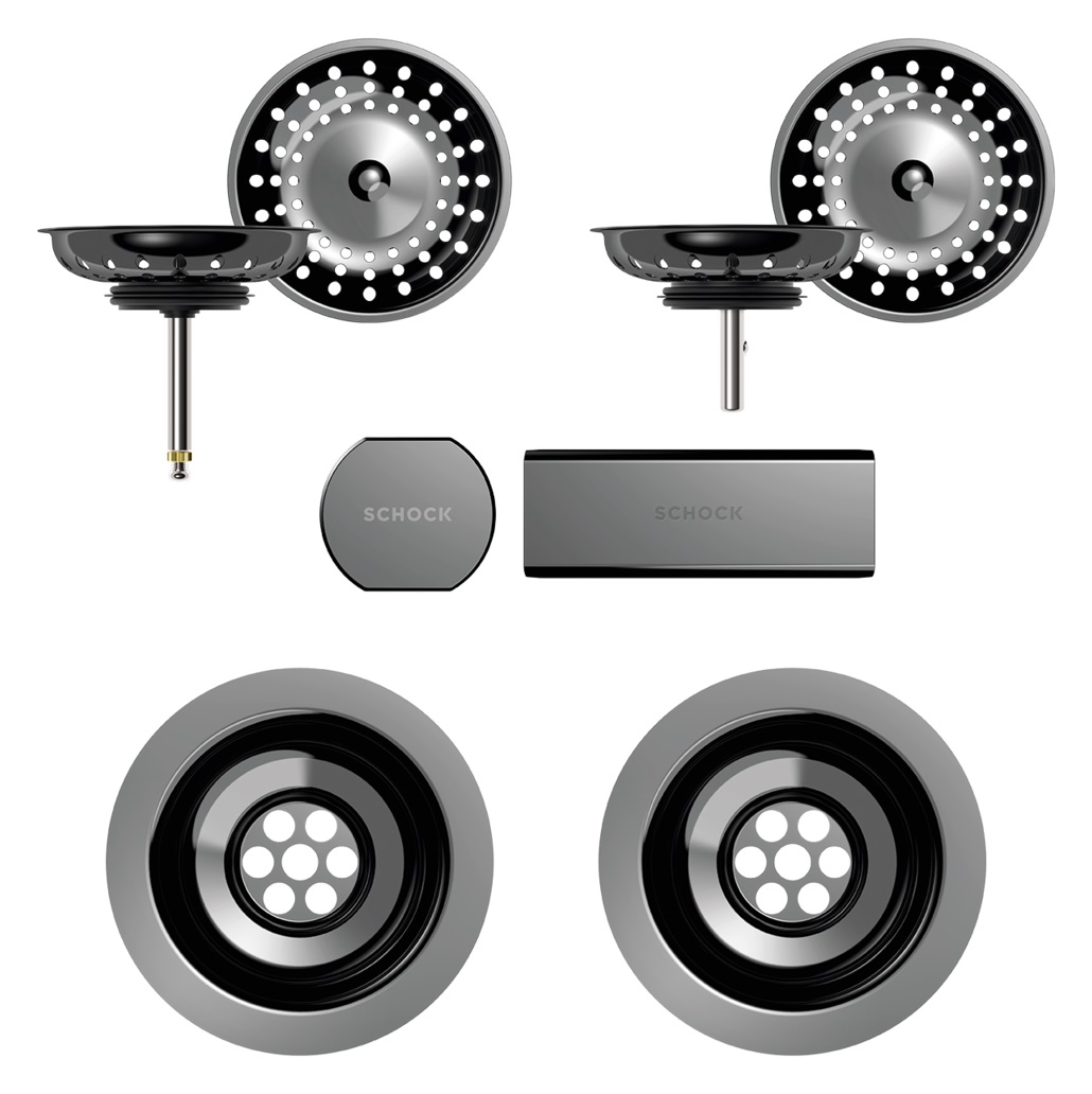 Vsako korito SCHOCK iz linije Cristadur® lahko opremite s setom izliv, preliv in gumb v petih barvah: srebrni (EDM), belo-zlati (White Gold), bakreni (Copper), temno sivi (Gunmetal) ter črni (Puro).