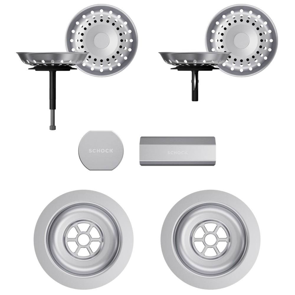 Vsako korito SCHOCK iz linije Cristadur® lahko opremite s setom izliv, preliv in gumb v petih barvah: srebrni (EDM), belo-zlati (White Gold), brušeni bakreni (Copper), brušeni temno sivi (Gunmetal) ter črni (Puro).