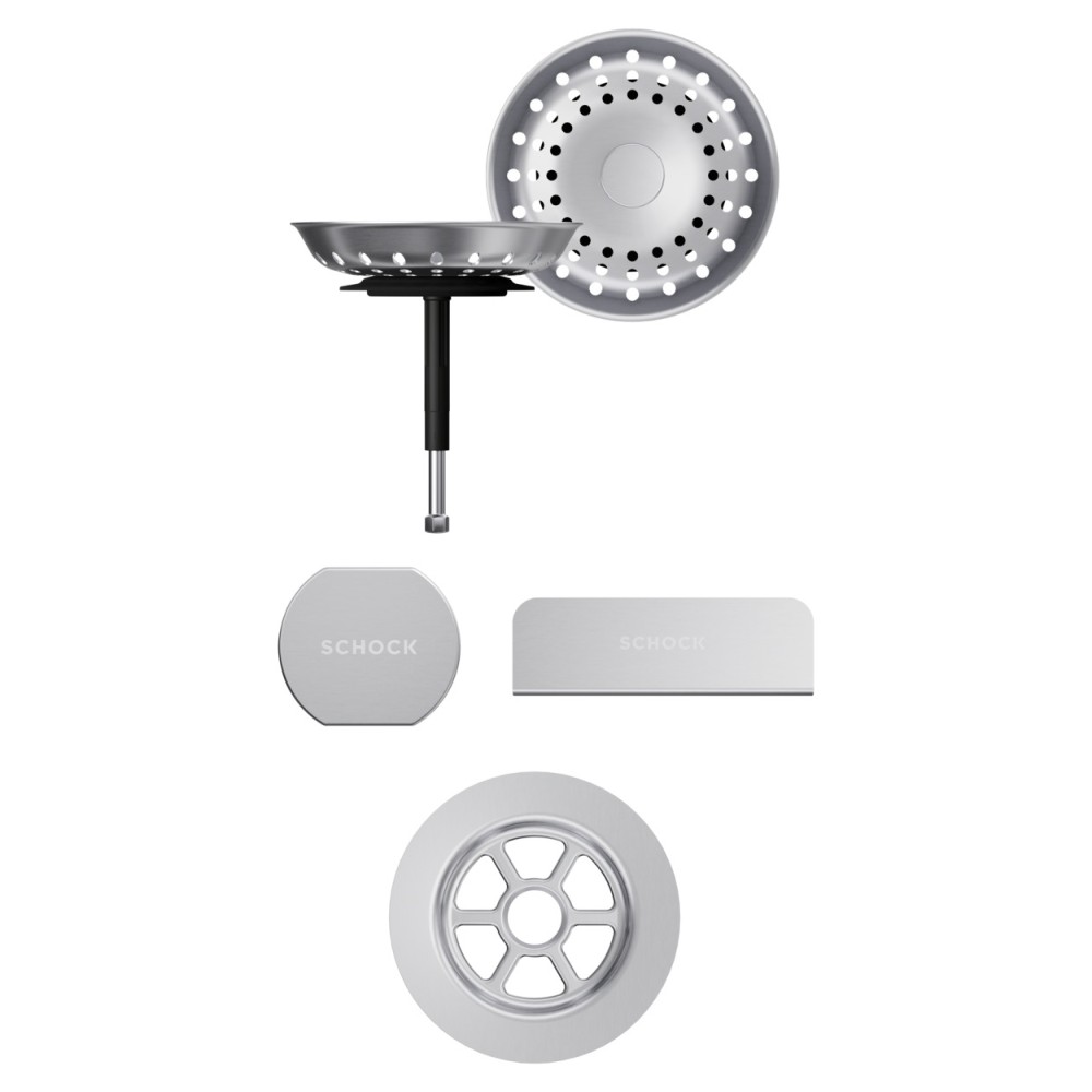 Vsako korito SCHOCK iz linije Cristadur® lahko opremite s setom izliv, preliv in gumb v petih barvah: srebrni (EDM), belo-zlati (White Gold), brušeni bakreni (Copper), brušeni temno sivi (Gunmetal) ter črni (Puro).