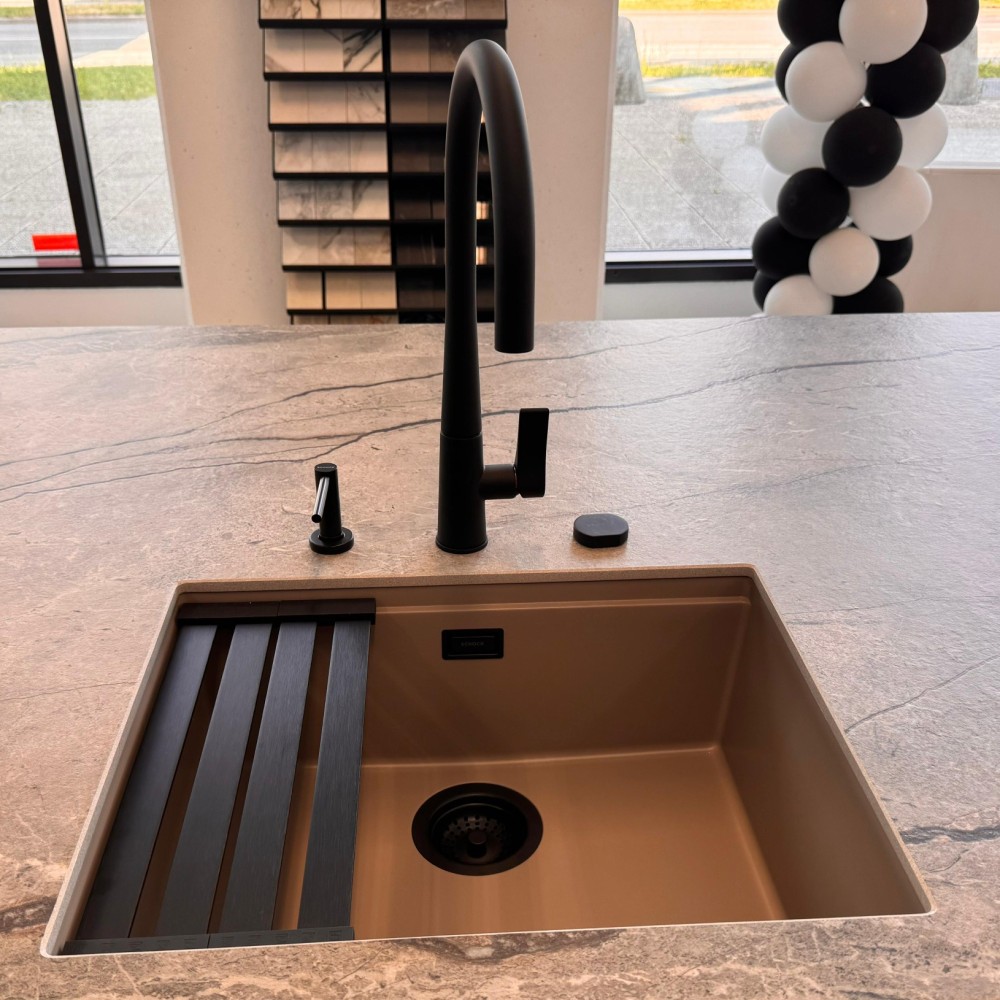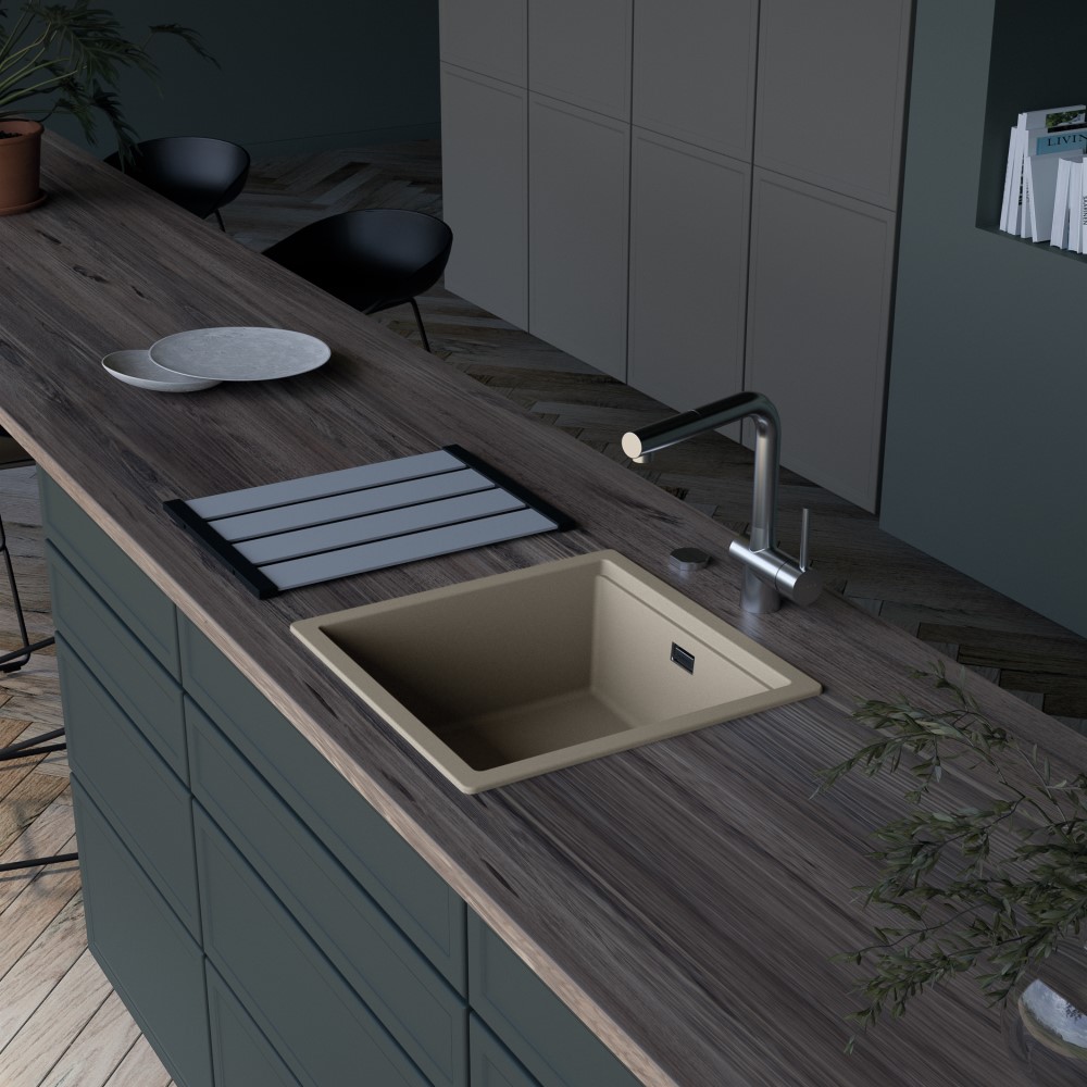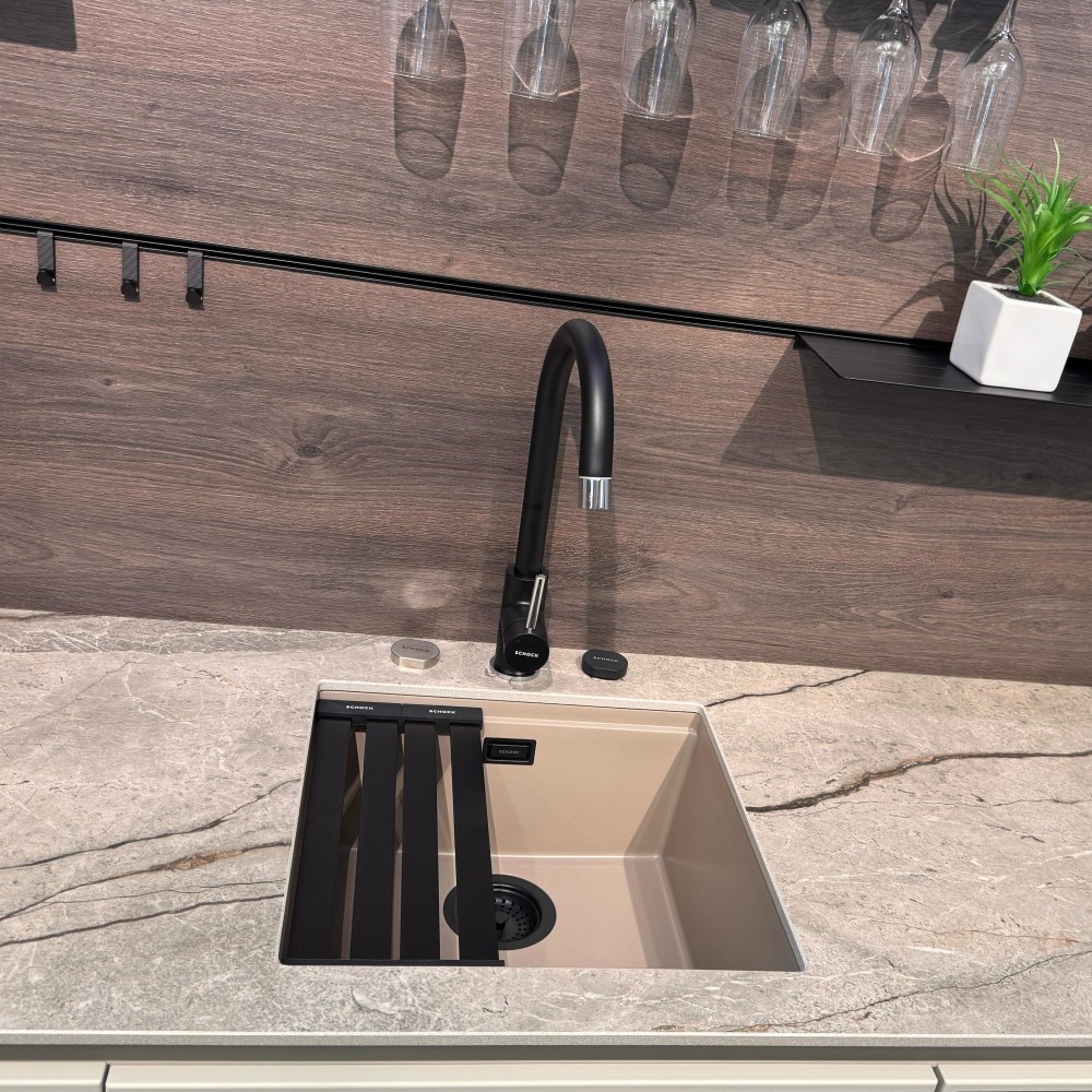 Korito prihaja iz prestižne linije Cristadur® in v tej taupe barvi Twilight se bo lepo umestilo v vsako kuhinjo, lahko pa ga dobite tudi v štirih drugih barvah. Koritu lahko dodate še druge dodatke kot so izlivno prelivna garnitura v različnih barvnih obdelavah, dva različna silikonska odcejalnika, dva različna dizajnerska odcejalnika iz plemenitega jekla v večih barvah, nosilec s posodo in/ali cedilom, rezalna deska, gumb za avtomatsko odpiranje in zapiranje izliva, praktično kotno posodico ter več dozirnikov za milo.