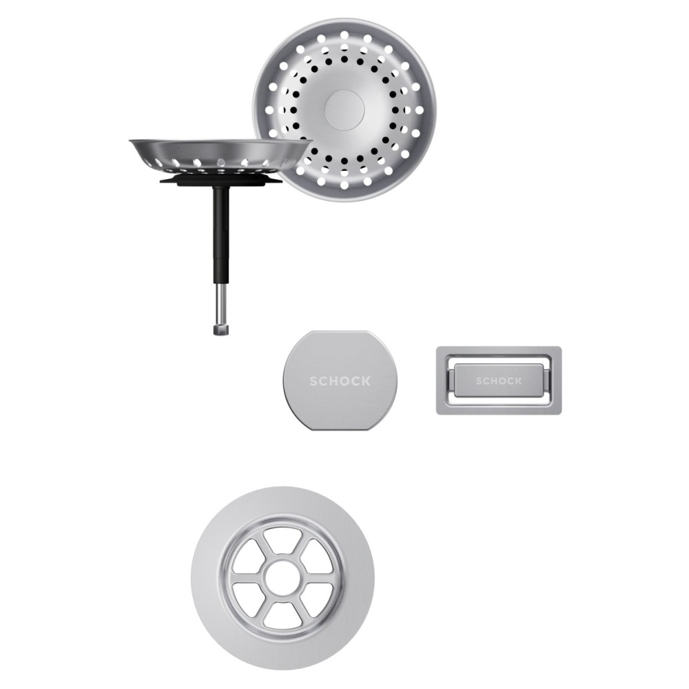 Vsako korito SCHOCK iz linije Cristadur® lahko opremite s setom izliv, preliv in gumb v petih barvah: srebrni (EDM), belo-zlati (White Gold), brušeni bakreni (Copper), brušeni temno sivi (Gunmetal) ter črni (Puro).