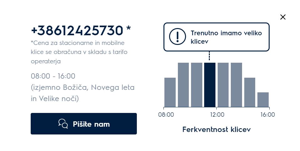 6. Če pa boste izbrali možnost "Pokličite nas", se vam bo odprl oblaček s telefonsko številko in podatki o pogostosti klicev. Glede na zasedenost klicne službe se lahko odločite, ali jih boste vseeno poklicali ali jim pisali preko spletnega klepetalnika. Pozor - klicna služba ima delovni urnik med delavniki od 8. do 16. ure.